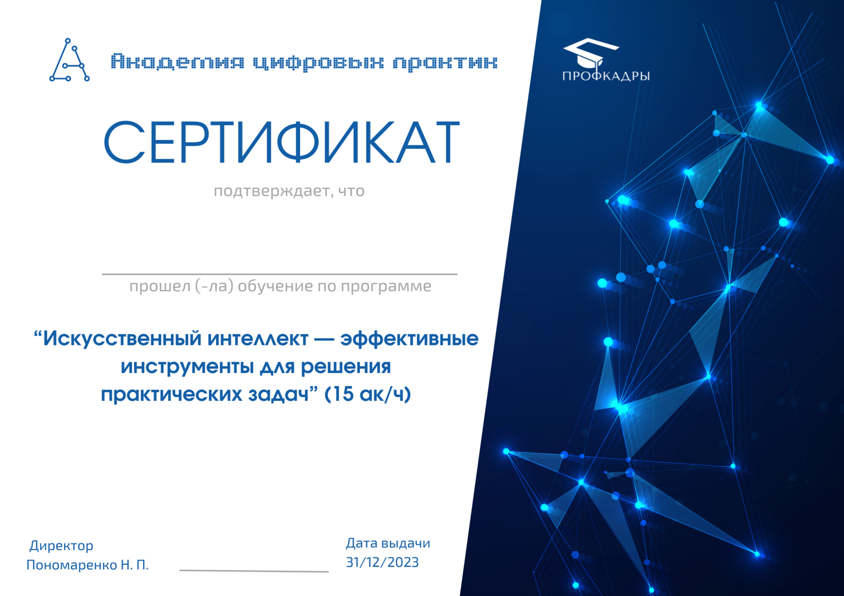 Преподаватель информатики, призер III Всероссийской олимпиады для учителей информатики «ПРО-IT», финалист Международной олимпиады учителей-предметников «ПРОФИ-2023» по информатике, сфера научных интересов- искусственный интеллект, нейросети
